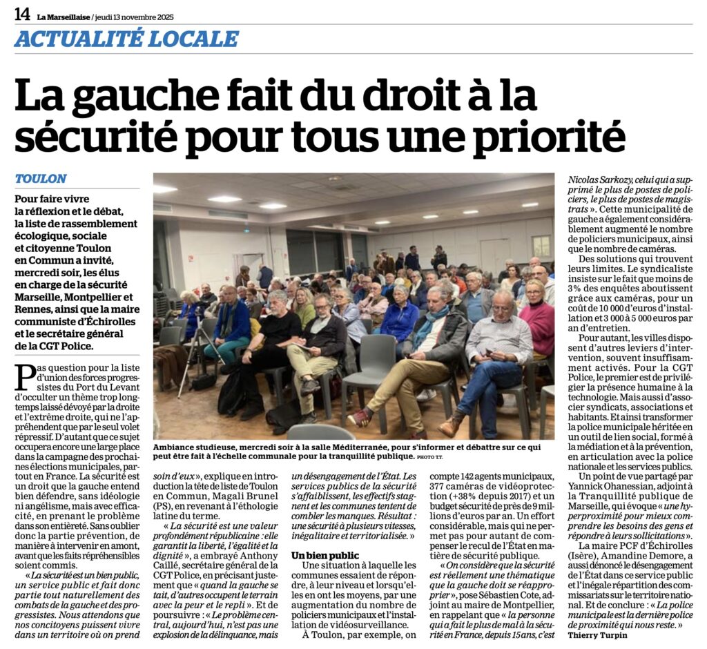 Nous avons écouté avec grand intérêt des élus de Marseille, Montpellier, Rennes et Echirolles, puis débattu sur certains points. Pas de baguette magique pour la sécurité, mais toute une série d’actions qui amènent plus de tranquillité dans nos villes. De belles sources d’inspiration pour Toulon !