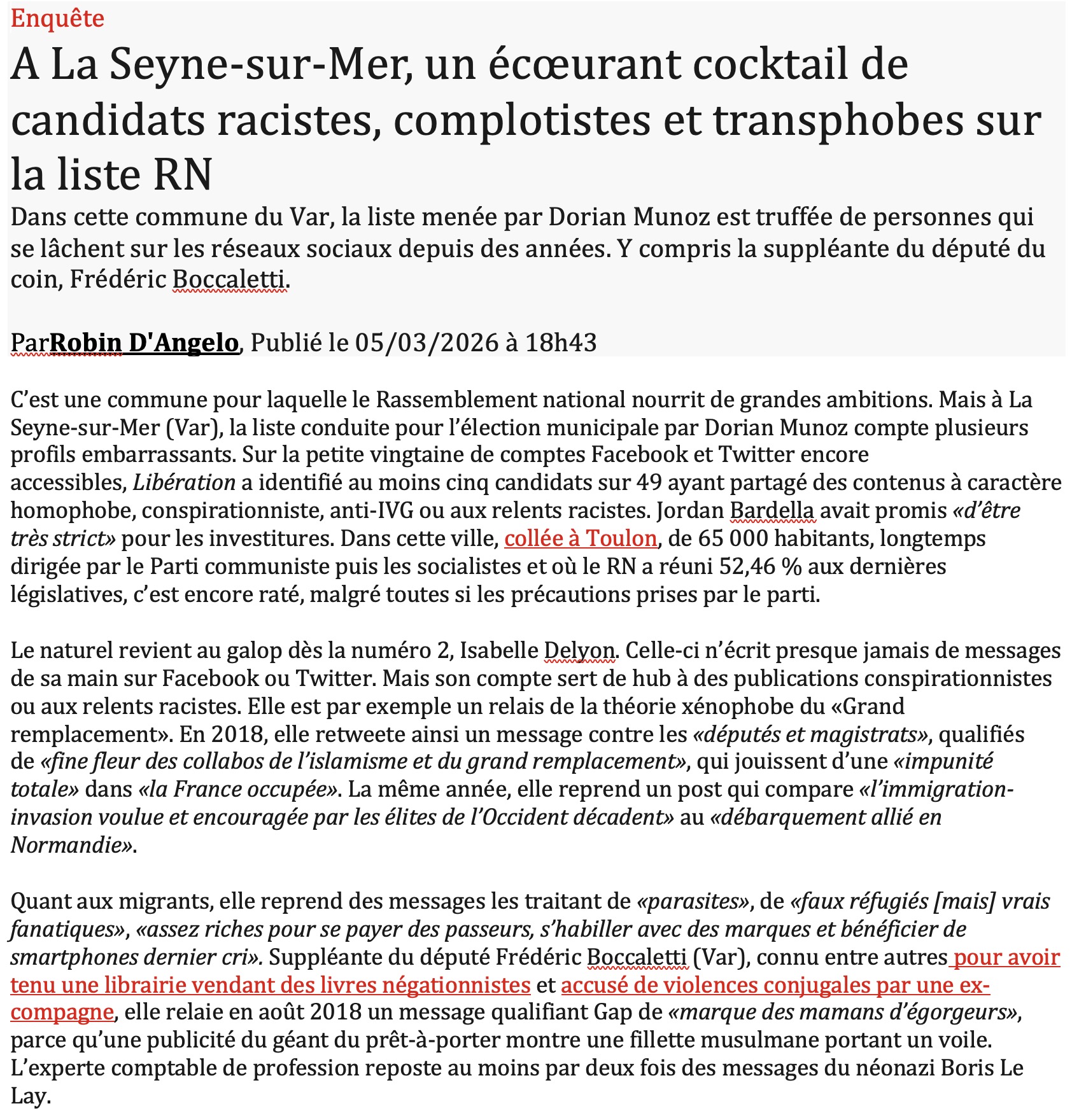 Et pour ceux qui pensent que rien n’a changé, lisez cet article de Libé où ils montrent les étonnants points de ressemblance entre le programme de Lavalette et celui de Le Chevalier en 1995 : https://www.liberation.fr/politique/elections/municipales-a-toulon-lavalette-sinspire-du-programme-fn-de-1995-et-fait-des-clins-doeil-aux-nostalgiques-de-lalgerie-francaise-20260302_6VZR3GS66NG7FPUV2OSLH55ES4/