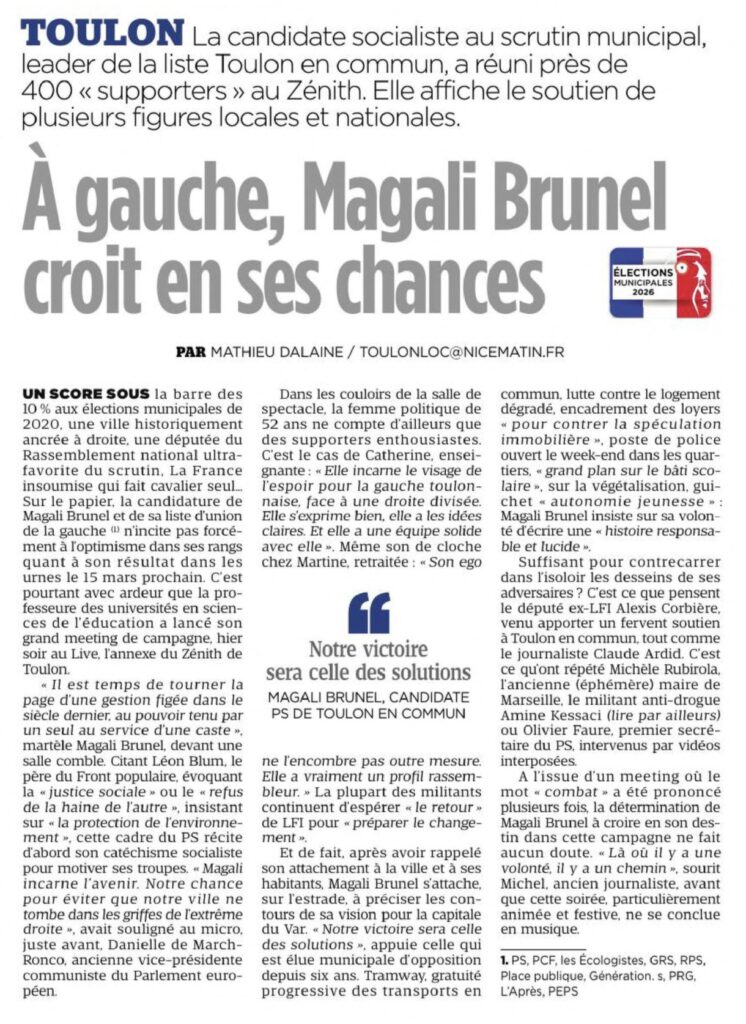 Le Var Information a aussi fait un reportage sur ce meeting : https://mesinfos.fr/83000-toulon/municipales-2026-a-toulon-magali-brunel-s-engage-dans-la-bataille-238171.html
