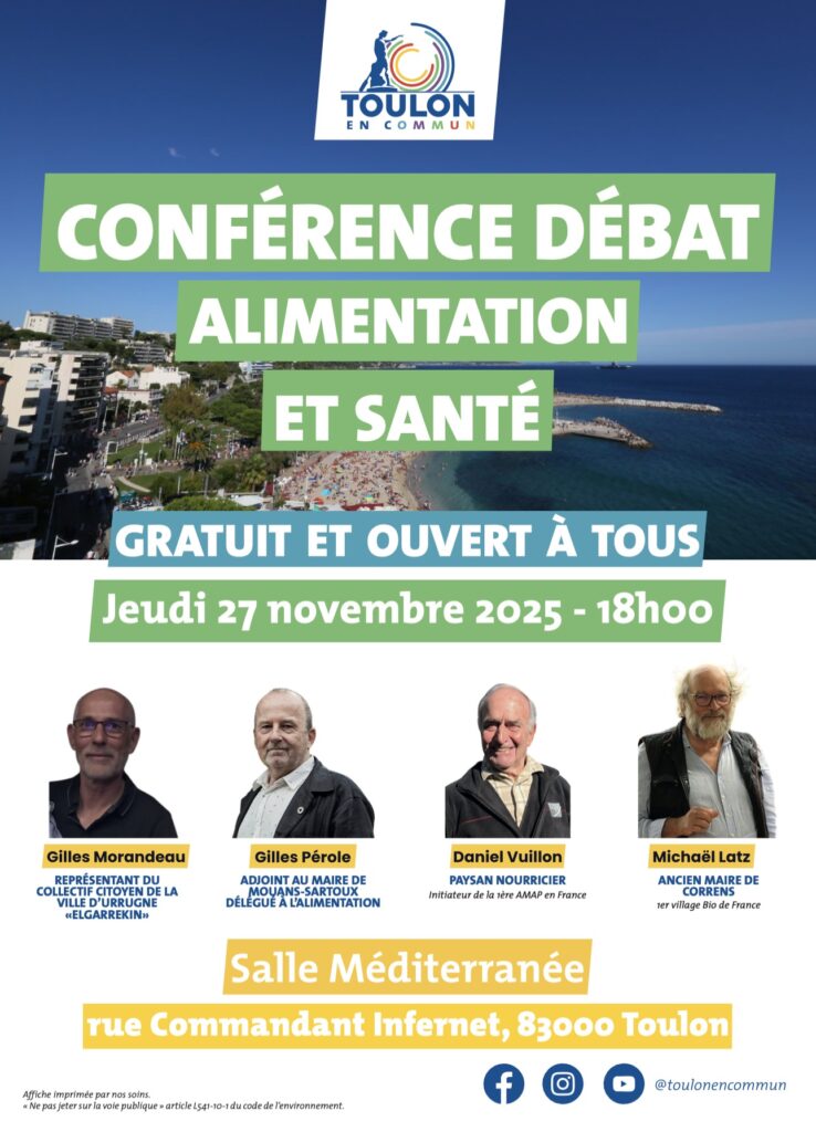 Une belle conférence avec comme invité des élus de Mouans-Sartoux, Correns, Urrugne et Daniel Vuillon, paysan nourricier à